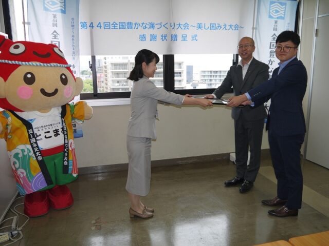 令和7年10月14日(火)に、三重県庁3階プレゼンテーションルームにおいて、日本トランスシティ株式会社様から「第44回全国豊かな海づくり大会~美し国みえ大会~」への協賛に対する感謝状贈呈式を行いました。