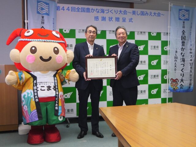 令和7年9月25日(水)に、三重県庁3階プレゼンテーションルームにおいて、イオンリテール株式会社様、尾鷲物産株式会社様、岡三証券株式会社様による「第44回全国豊かな海づくり大会~美し国みえ大会~」への協賛に対する感謝状贈呈式を行いました。