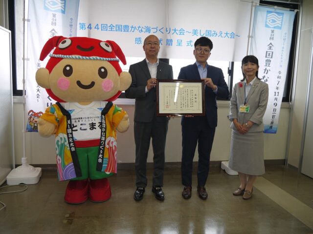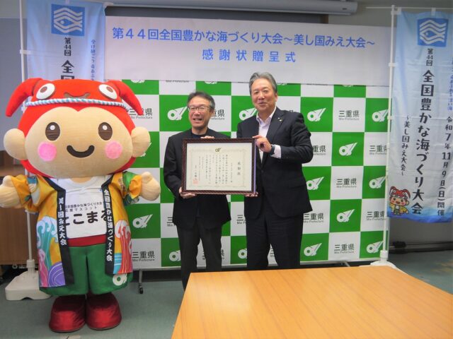 令和7年10月7日(火)に、三重県庁3階プレゼンテーションルームにおいて、KAISO BANK様から「第44回全国豊かな海づくり大会~美し国みえ大会~」への協賛に対する感謝状贈呈式を行いました。