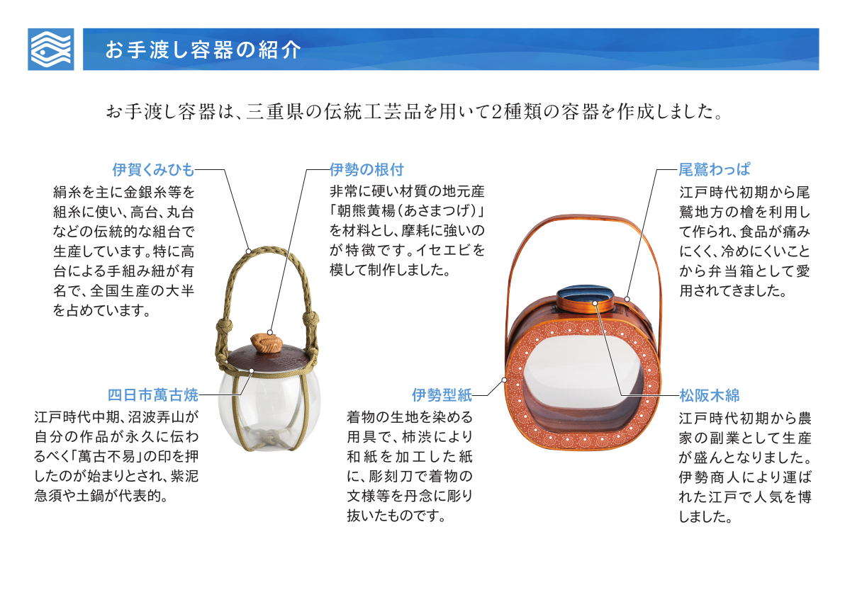 左の容器は、「ビン玉」をイメージし、伊賀くみひもで包まれ、取っ手には伊勢の根付、蓋には四日市萬古焼を用いて作製しました。右の容器は、海女の「いそめがね」をイメージし、尾鷲わっぱで形をつくり、本体と蓋の装飾に伊勢型紙と松阪木綿を用いて作製しました。