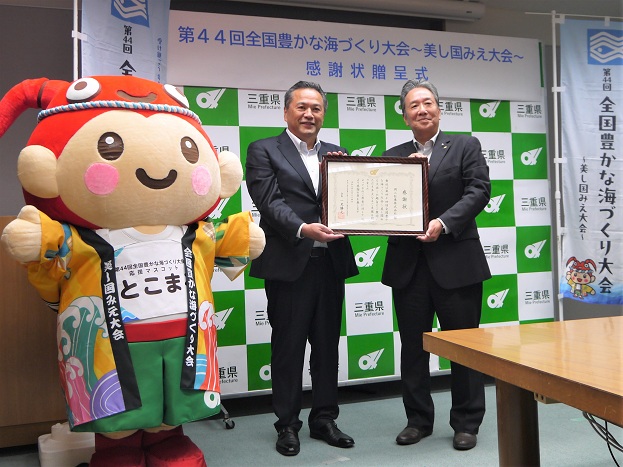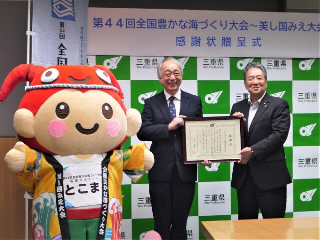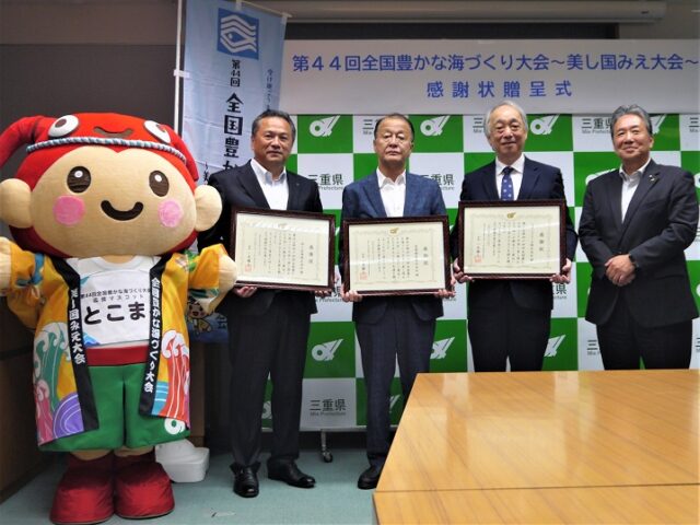 令和7年9月25日(水)に、三重県庁3階プレゼンテーションルームにおいて、イオンリテール株式会社様、尾鷲物産株式会社様、岡三証券株式会社様による「第44回全国豊かな海づくり大会~美し国みえ大会~」への協賛に対する感謝状贈呈式を行いました。
